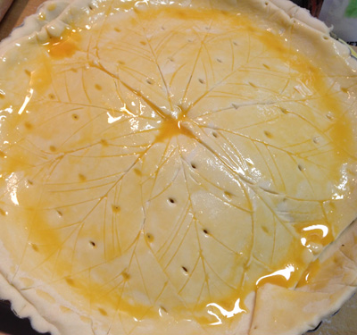 ・表面のパイ生地をかぶせて、ペティナイフで切れ込みを入れて