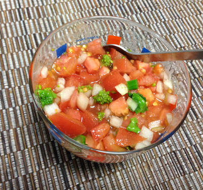 今回の配合はトマト1個・玉ねぎ1/4個・菜の花1本・タバスコ小さじ1・塩小さじ1/2ってところでした。