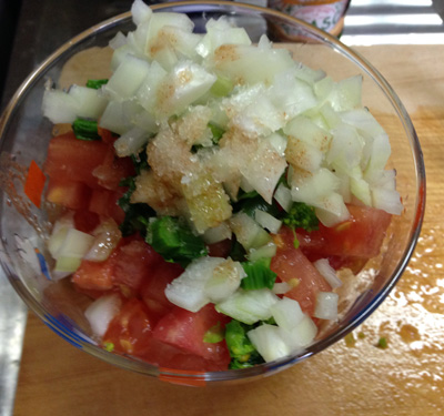 ・最初にサルサを作ります。トマトは1cm角くらいの粗みじん、玉ねぎは5mm角くらいのみじん切りにします。