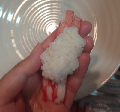 この後ネタを返して全体の形を整えるように握ったら完成です。