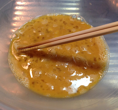 卵の白身を切るようにして混ぜ、だし汁・砂糖・みりん・塩を加えて味を調えます。