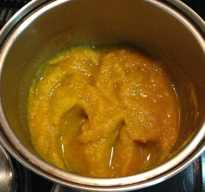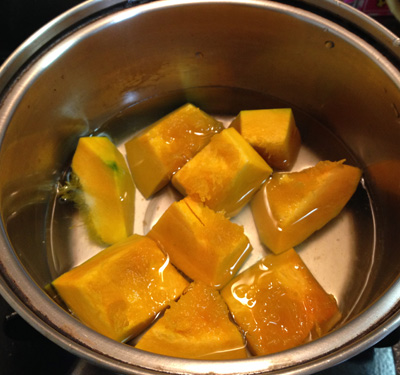 20分ほど煮立たせると、かぼちゃがグズグズに煮崩れてきます。