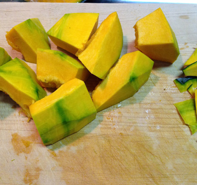 ・かぼちゃを5センチ角に切り、皮をむきます。ちょっと青々した部分が残っていますが、煮えた後で取り除けるので