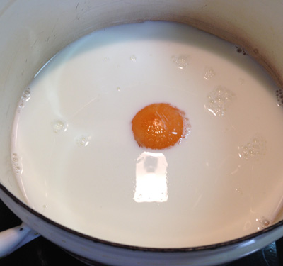 ・続いて、鍋に卵黄・砂糖・牛乳を入れて沸騰する直前まで温めます。