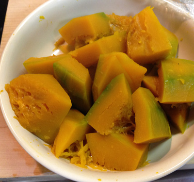 ・かぼちゃを適当な大きさに切って皮をむき、ラップをかけて電子レンジで5分ほど加熱します。