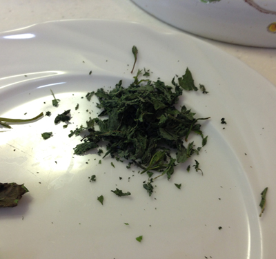 ・スープを煮込むのと並行して、乾燥させたミントを手で砕きます。