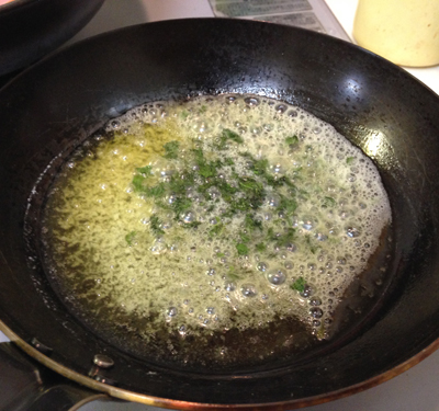 ・熱したフライパンにバターを溶かし、粉末ミントをさっと加えます。