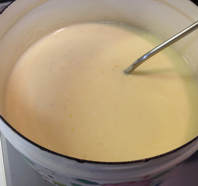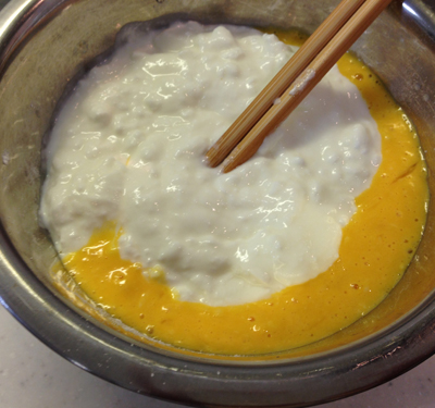 ・コンロをとろ火に調整し、鍋に卵・小麦粉・ヨーグルトを混ぜたものを