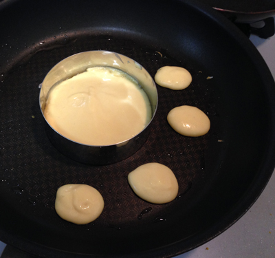 ・弱火で熱したフライパンにセルクルを設置し、パンケーキ生地を流し込みます。