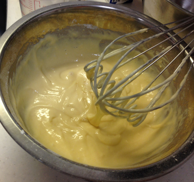 ・卵、砂糖、牛乳、サラダ油を泡立て器でよく混ぜ、ふるった薄力粉とベーキングパウダーを加え混ぜます。