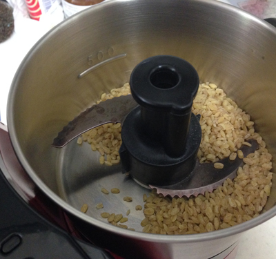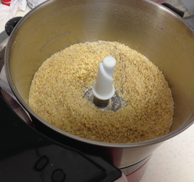 ・まずはブルグルをフードプロセッサーで粉砕します。というのもブルグルには粒タイプと細かいタイプがあって、