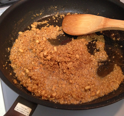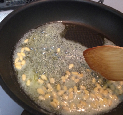 ・バターをフライパンで温め、松の実を加えて弱火で炒めます。
