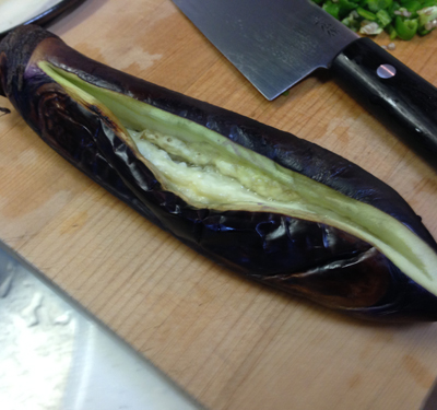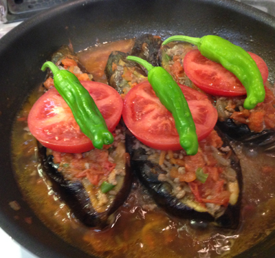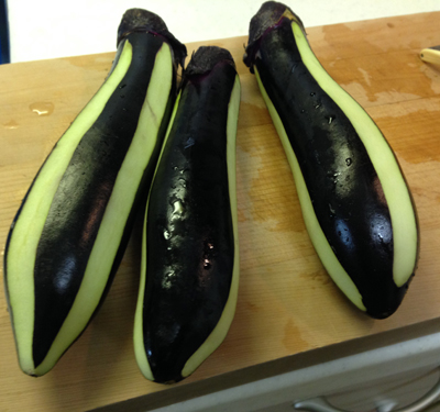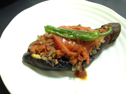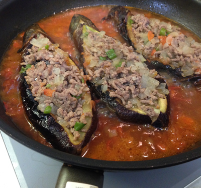 なすを縦に裂いて、中にひき肉の詰め物をする料理なので、