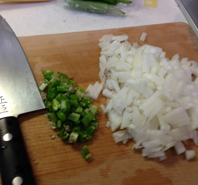 ・詰め物にする玉ねぎとししとうをみじん切りにしておきます。