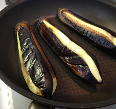 ・なすをフライパンでこんがり焼きます。ここでは油は引かない方がよさそう。