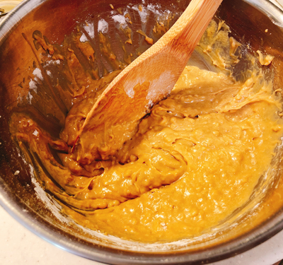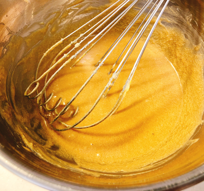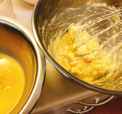 ・ときほぐした卵と牛乳を少しずつ加え混ぜます。
