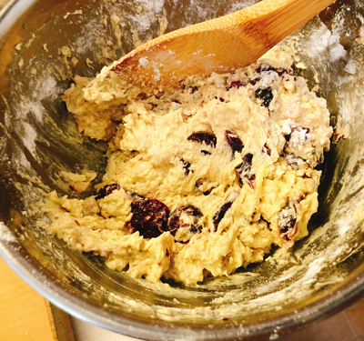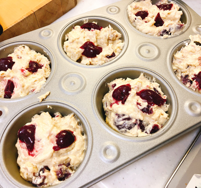 ・刻んだアメリカンチェリーと、ふるった小麦粉・ベーキングパウダーを