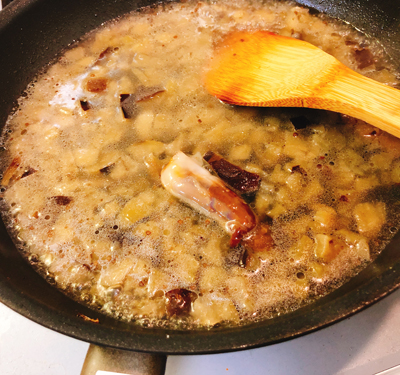 ・水を加えてナスが柔らかくなるまで煮込んだら、イカのワタと墨を加えてつぶします。