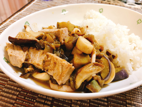 ナスとエリンギのやさしい味と食感のおかげで、意外とマイルドにまとまった印象です。