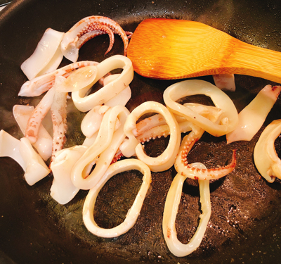 ・続いてイカも塩コショウで炒めます。