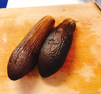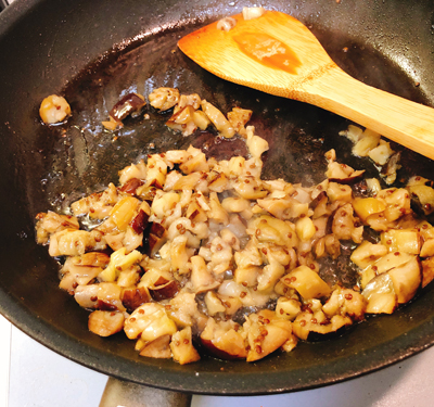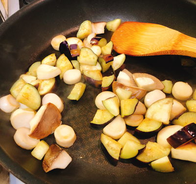 ・粗熱の取れた焼きナスの皮をむいてみじん切りにして、油で炒めます。
