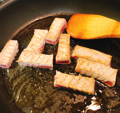 まずはマグロに塩コショウをして、ステーキ風に焼き目をつけます。