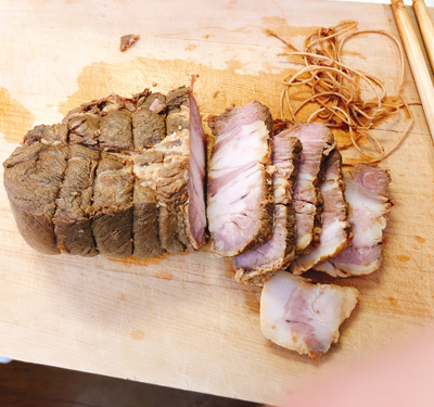 タコ糸を切って取り除き、お好きな厚さに切り分けます。