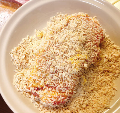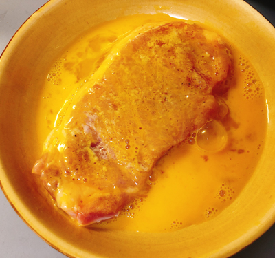 ・その後、よく溶きほぐした卵液に豚肉をくぐらせます。