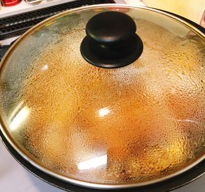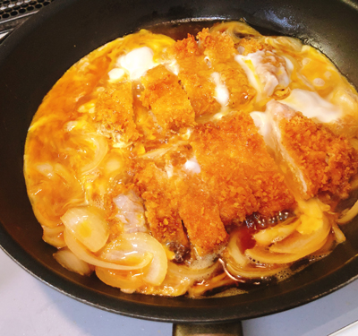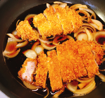 ・さらに切ったカツを投入し、上からスプーンで煮汁をかけます。