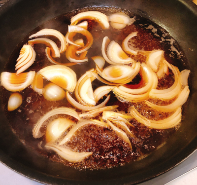 調合した割下をフライパンでひと煮立ちさせ、玉ねぎを投入して火を通します。