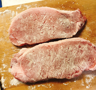 ・豚肉に塩こしょうをして、小麦粉をまんべんなくまぶします。