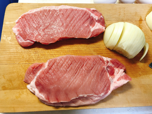 豚ロースの筋に切り込みを入れて、包丁の背で叩き