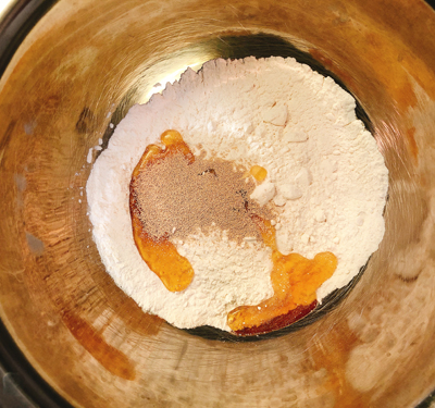 片方には蜂蜜とイースト、もう片方には塩とバターを入れます。