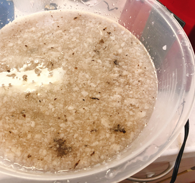 ・大きなボウルにぬるま湯と粉砕したこんにゃく芋を入れ、だまが