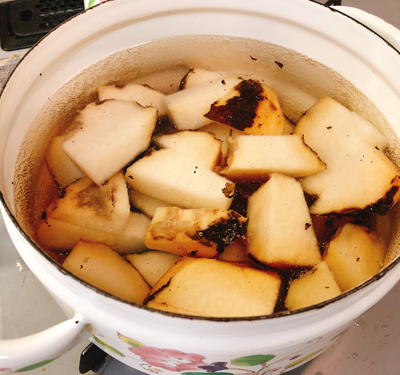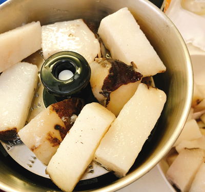 ・まずはこんにゃく芋を洗って皮を少しむき、適当な大きさに切ります。