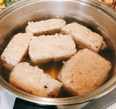 ・型から外したこんにゃくをたっぷりのお湯で30~40分ほど茹でていると、