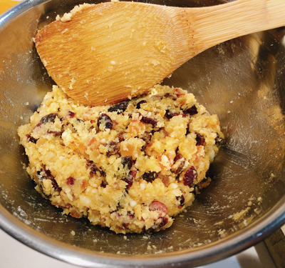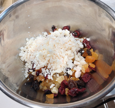 ・ブランデー漬けにしたドライフルーツと牛脂を混ぜます。