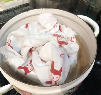 ・器をアルミホイルとふきんで包んで、お湯を張った鍋で2時間ほど蒸します。