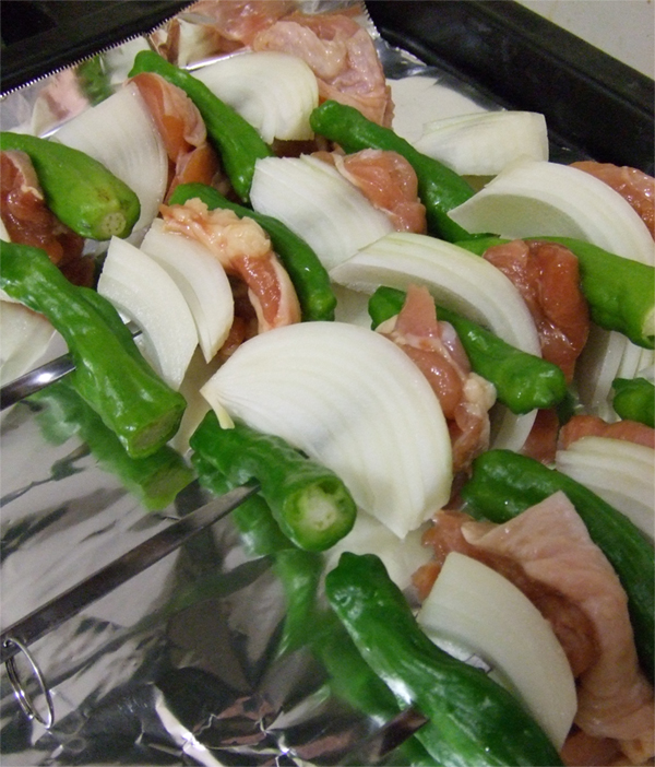 ・材料をししとう→玉ねぎ→肉の順に串に刺していきます。