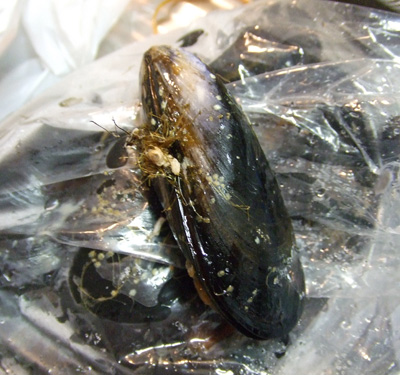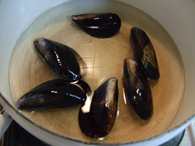 ムール貝は足糸というモジャモジャしたものが貝の中から出ているので