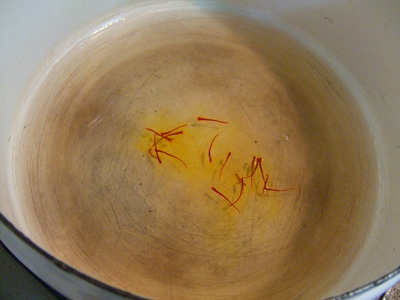 ・ムール貝をゆでた後の白ワインにサフランを投入して、色を浸出させます。