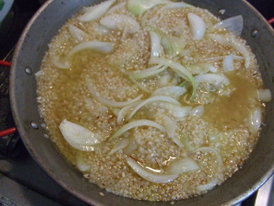 ・続いて米を投入。米の表面が透き通る程度まで炒めたら、フジツボゆで汁と