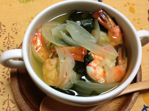 エビとワカメの海の幸が主体の味に、玉ねぎのやさしい甘さが加わって