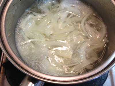 ・スープを鍋に戻して、薄切りにした玉ねぎを投入。