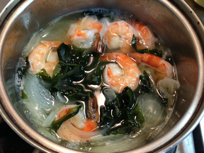 ・玉ねぎに火が通ったらエビとワカメを投入。