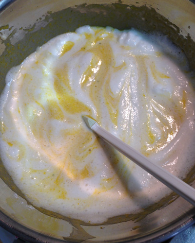 今回もまさにそれで、ボウルの上澄みの方はメレンゲ多めの