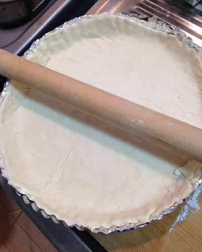 のばした生地をタルト型全体に敷き詰め、焼く直前まで