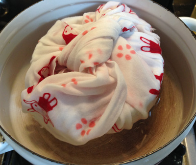 ・器をアルミホイルの上から布巾できっちり包み、お湯をはった鍋に入れて弱火で約2時間蒸します。