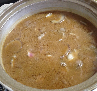 ・味噌を水に溶かして煮立て、猪肉を投入して弱火で煮込みます。
