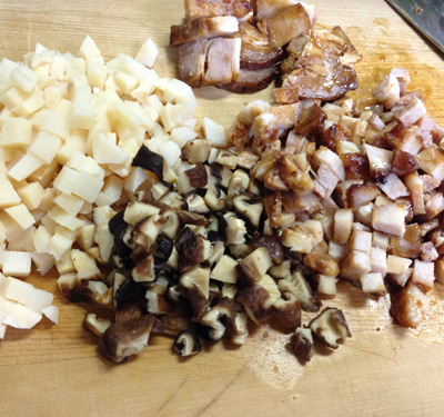 ・たけのこ水煮、もどした干ししいたけ、焼豚をそれぞれ粗みじんに切ります。